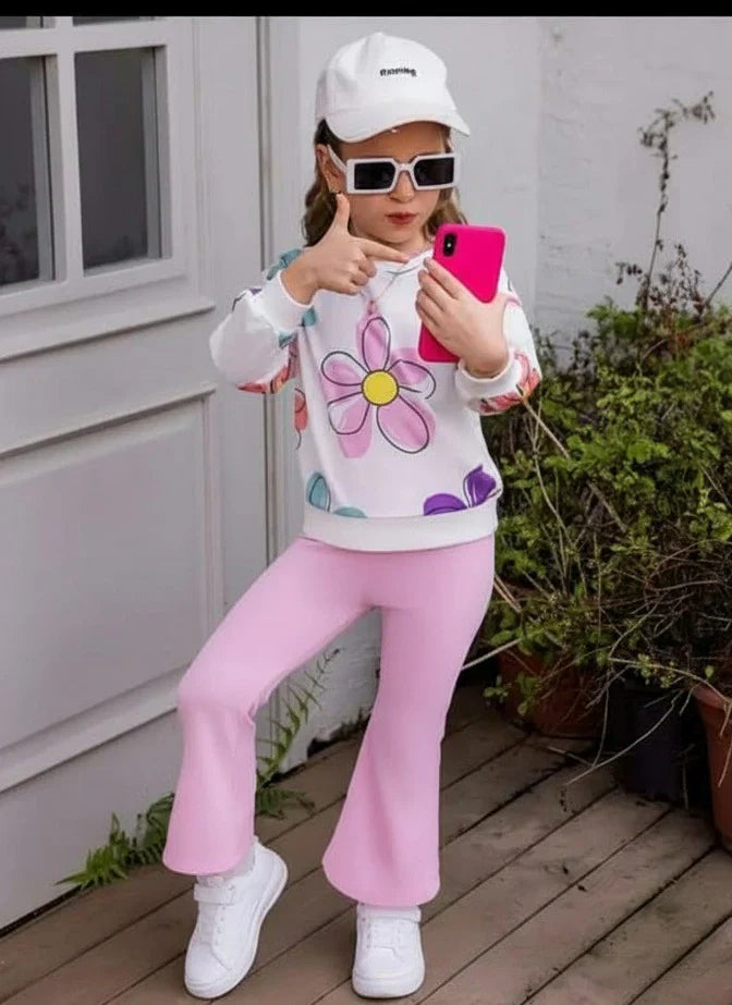 Off white Multi Big Flower Printed with Pink pajama Winter Girls Tracksuit (OM-634)
